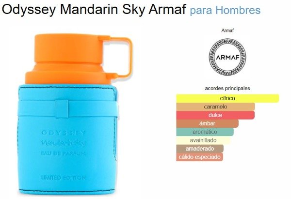 Odyssey Mandarin Sky de Armaf es una fragancia de la familia olfativa para Hombres. Esta fragrancia es nueva. Odyssey Mandarin Sky se lanzó en 2023. Las Notas de Salida son mandarina, naranja, azafrán y salvia; las Notas de Corazón son caramelo, haba tonka y cempasúchil (tagete, clavelón); las Notas de Fondo son ambroxan, cedro y vetiver.