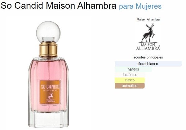 So Candid de Maison Alhambra es una fragancia de la familia olfativa Floral para Mujeres. So Candid se lanzó en 2022. La Nota de Salida es flor de azahar del naranjo; las Notas de Corazón son nardos y jazmín; la Nota de Fondo es leche.